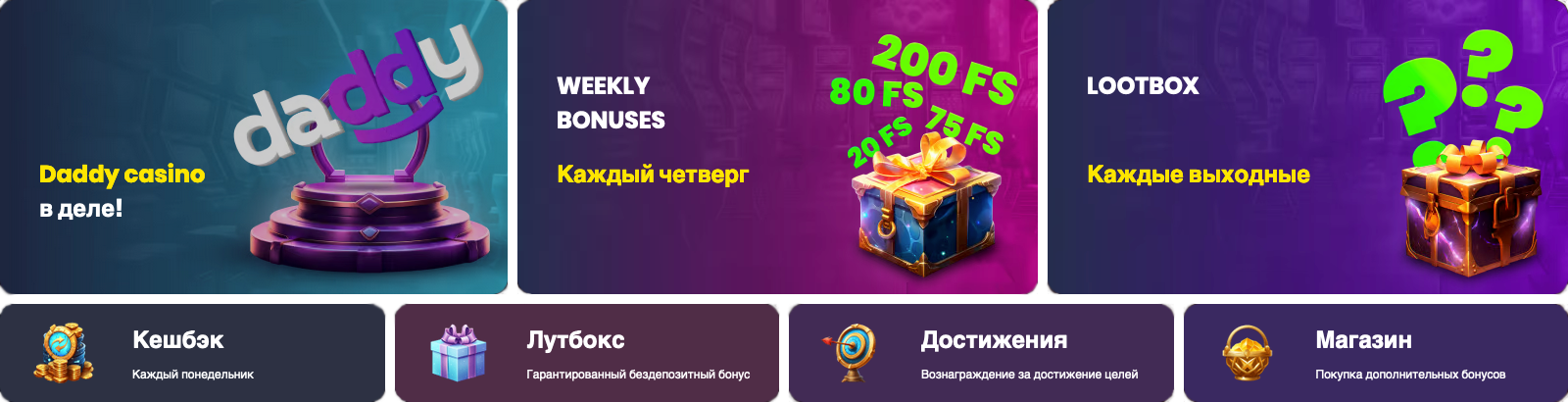Бонусная система казино Daddy состоит из поощрений для новичков и активных пользователей: